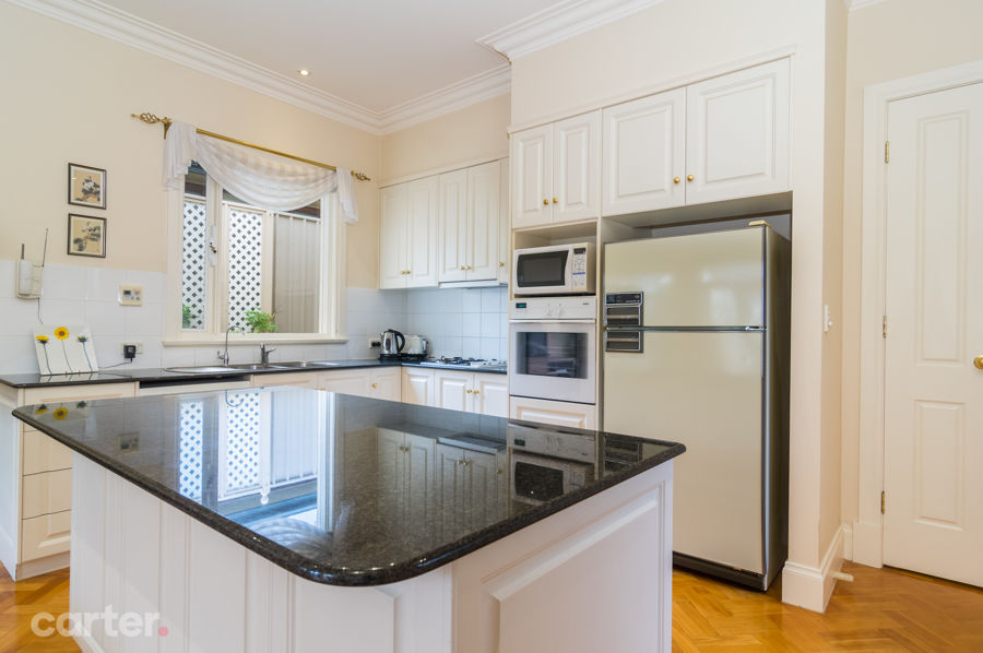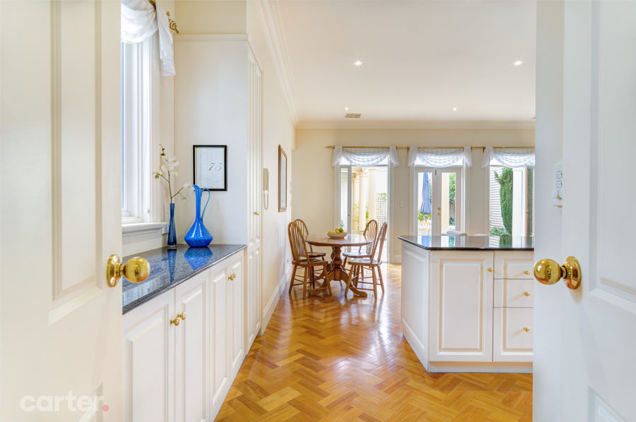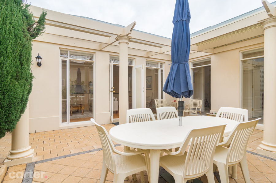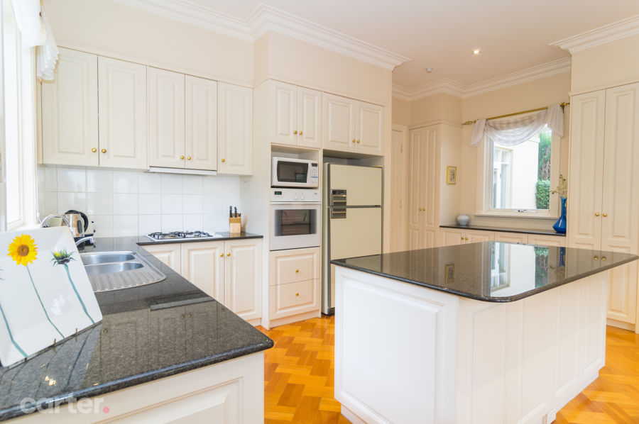 One of those courtyards takes pride and place at the home's expansive heart, and feeds open-plan living with parquetry floors leading to a kitchen adorned with dark granite tops, island/breakfast bar and Bosch appliances.