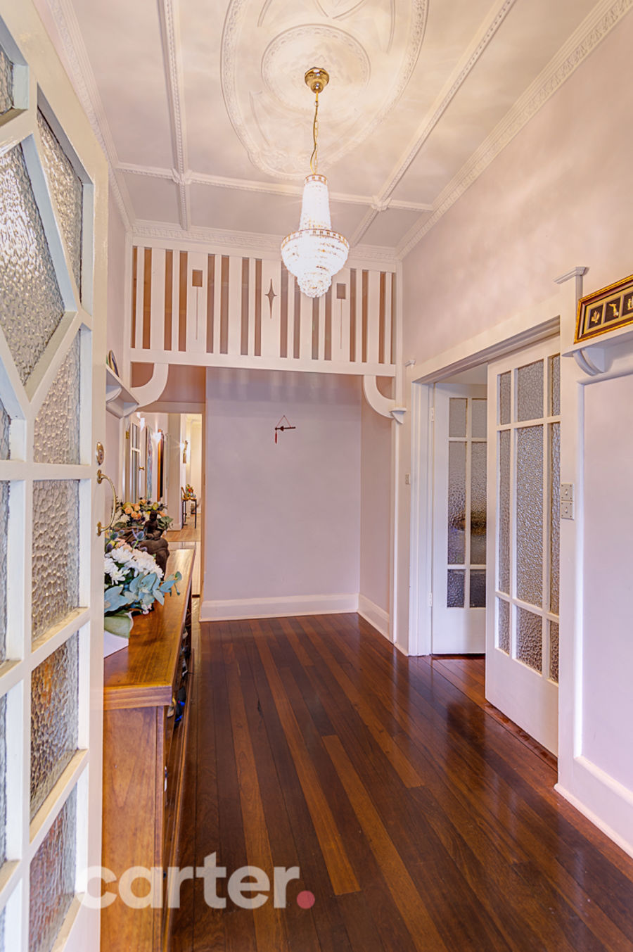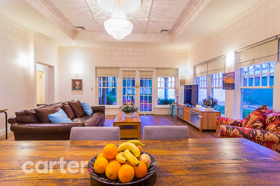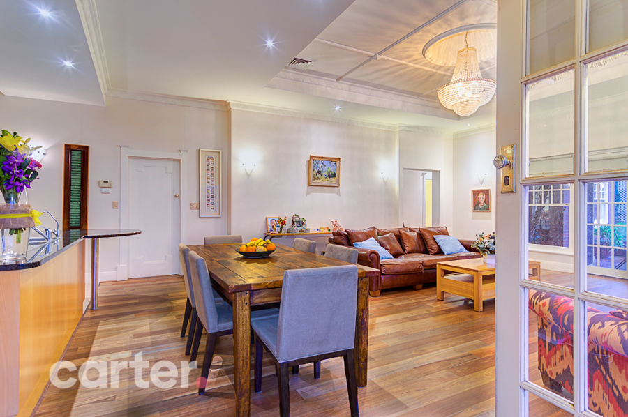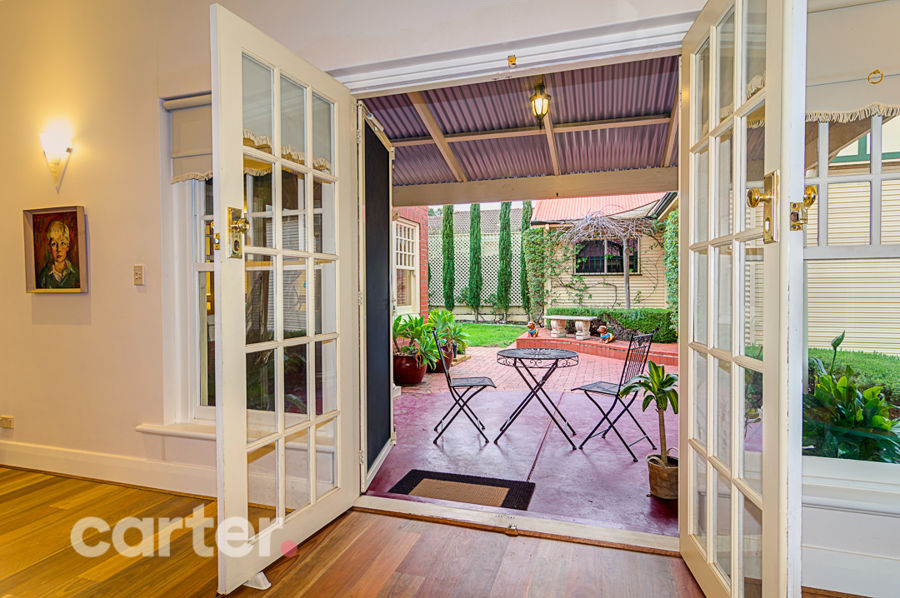 Together, those preserved original features include two double bedrooms, grand wide entrance and a formal lounge and dining room, each separated by French doors.