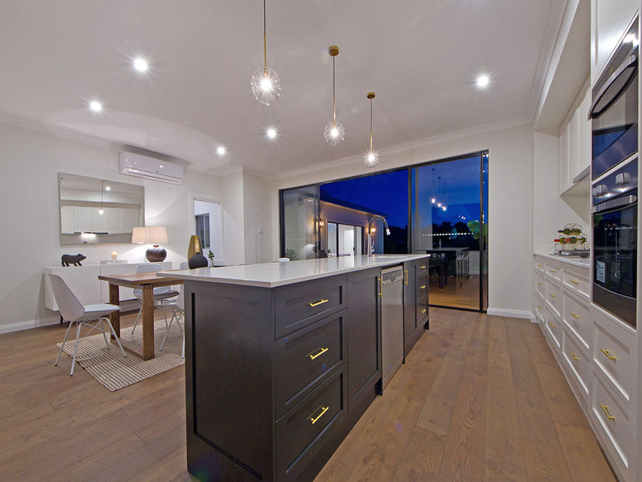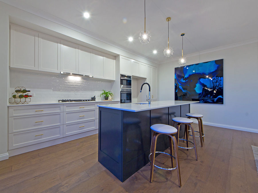 If there is one thing that defines Tim and Anastasia talents, it's the custom 2-pac kitchen with 900mm gas cooktop, shaker-inspired cabinetry, hanging pendants and show-stopping Caesarstone tops. Divine, indeed.