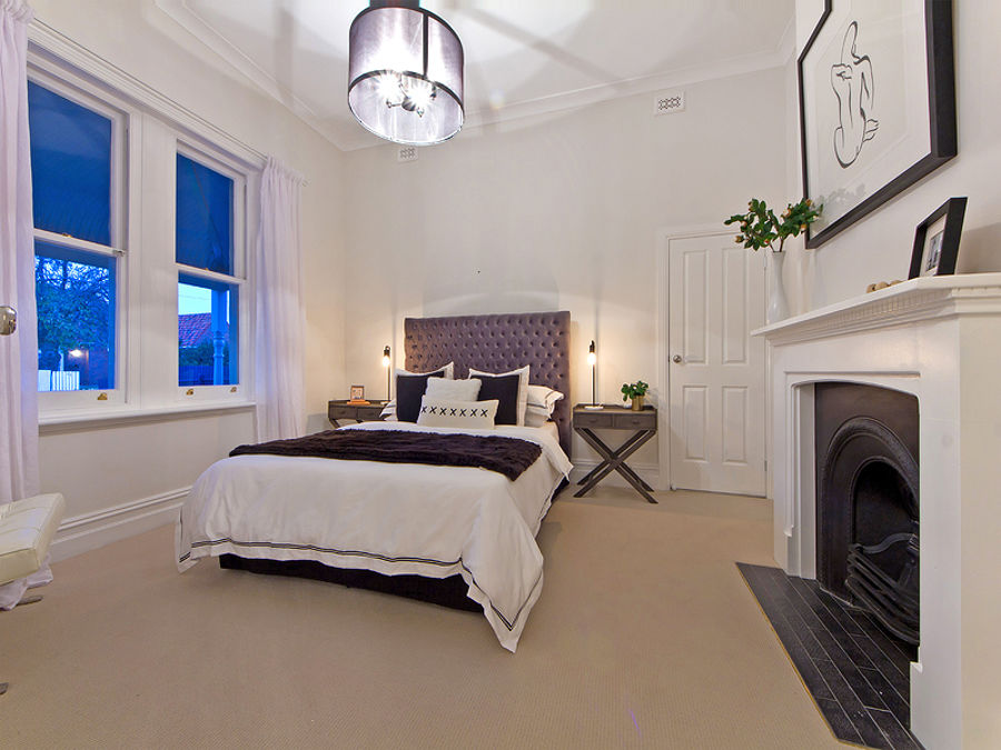 All the while, the dark hue of wide-set timber floors sings in contrast to flawless white walls, the ornate fireplaces with fresh carpets.