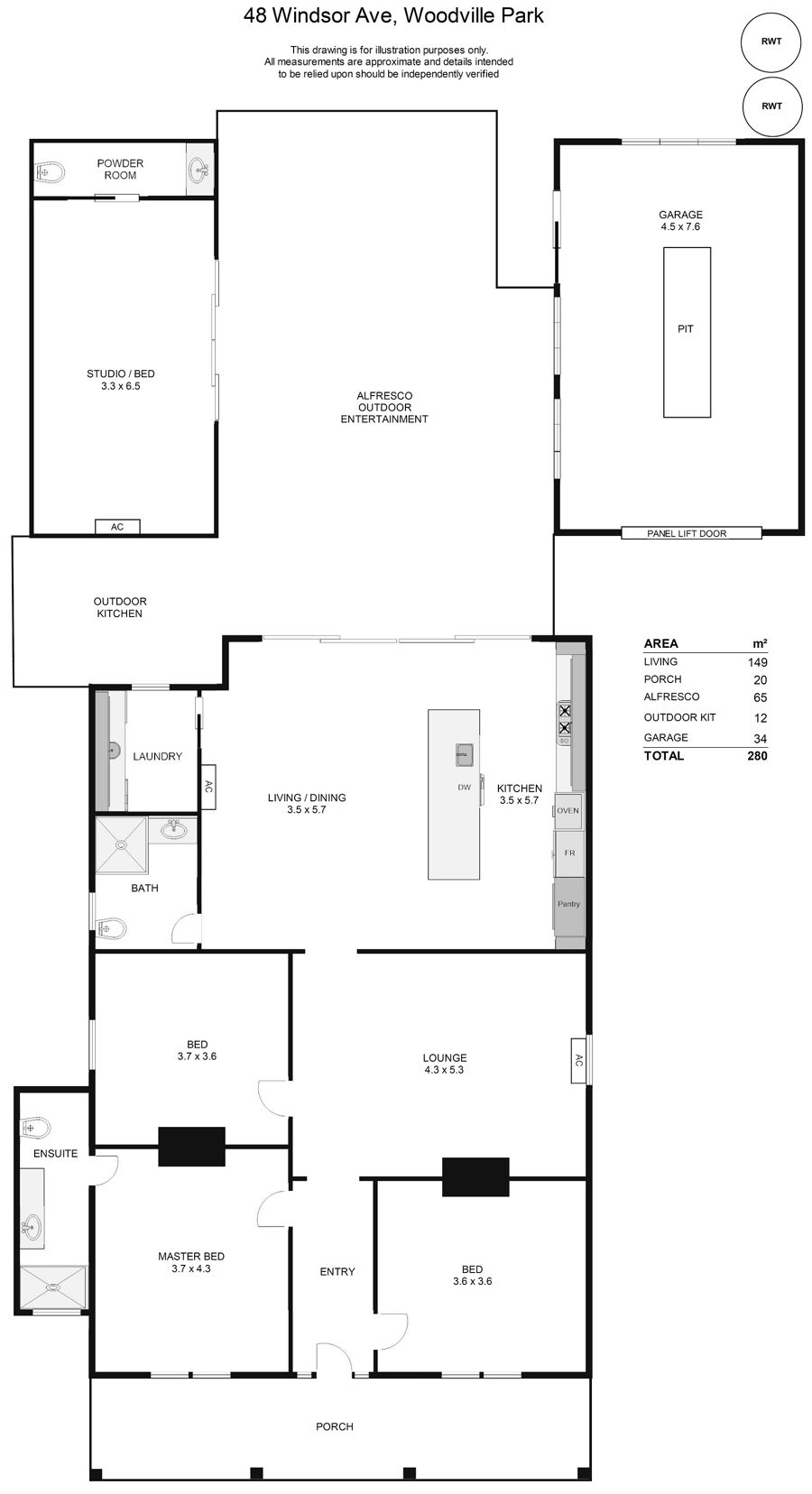 - Lock-up garage with remote Panelift entry, plus onsite parking for a further four cars