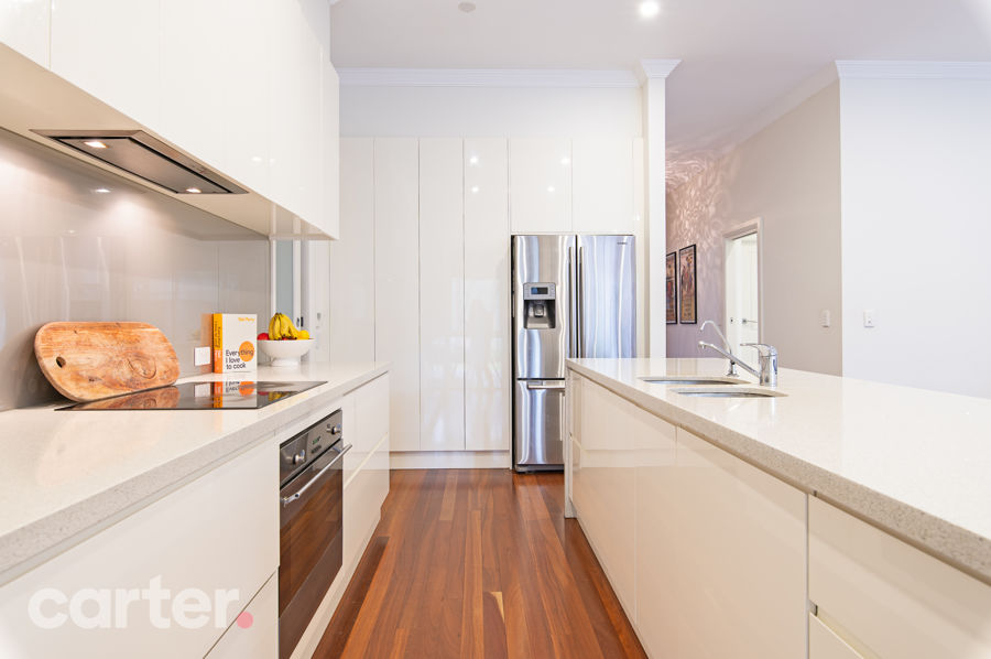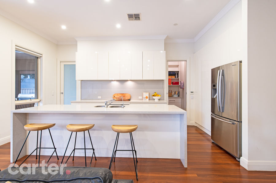 But the true star has to be the main kitchen; headlined by waterfalling Caesarstone, expansive island, two-pack cabinetry in pure white, glass splash backs, Smeg appliances and a butler's pantry.