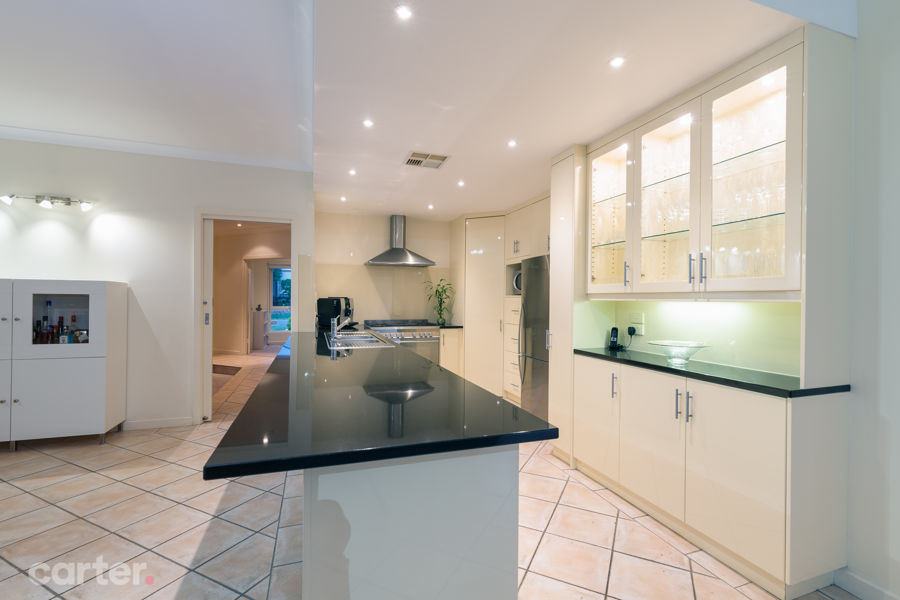 Work your culinary magic in a kitchen with a sea of striking black granite benchtops, breakfast bar, glass splashbacks, and a freestanding 900mm oven/gas cooktop that a commercial cook would be proud of.