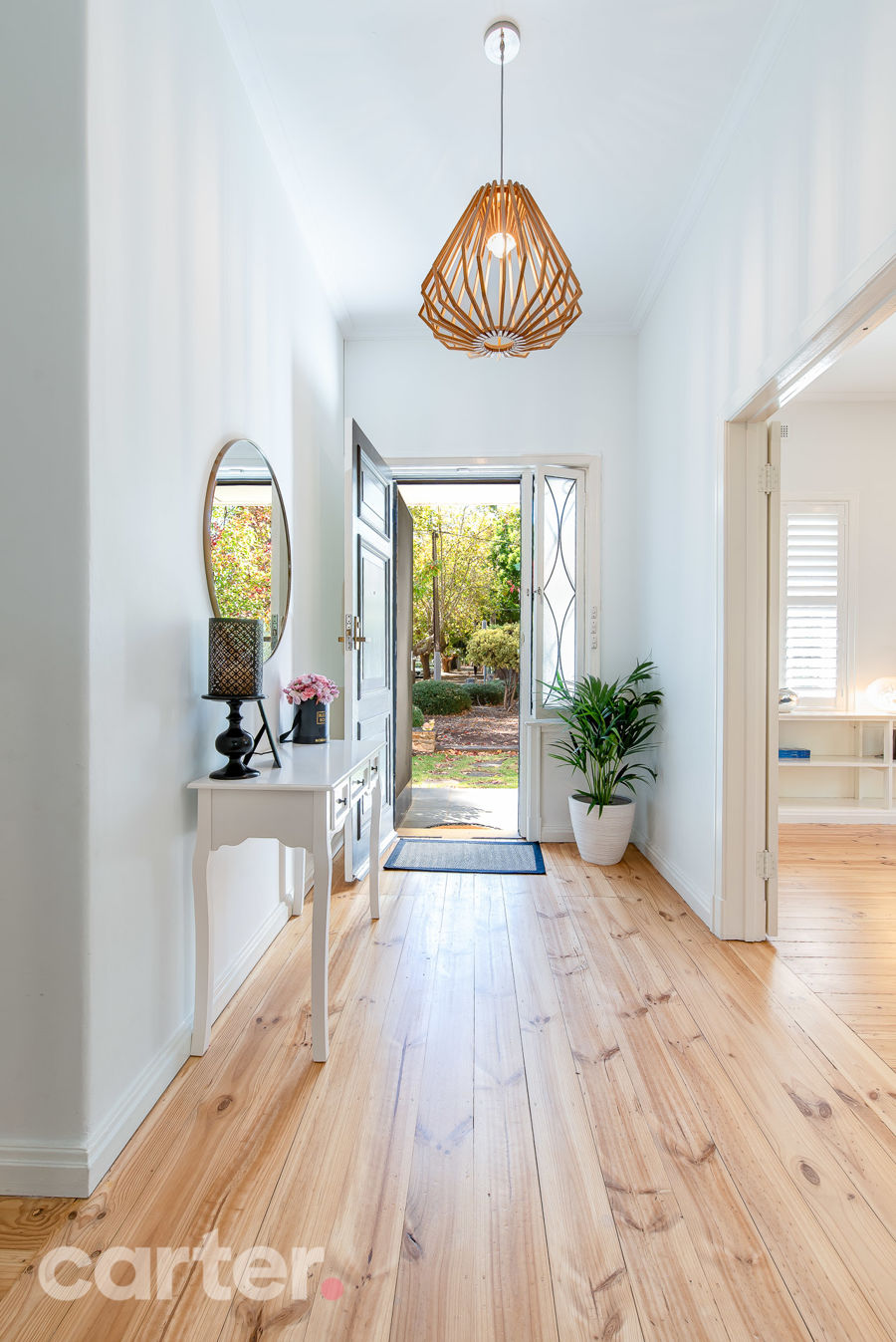 - Polished pine floorboards