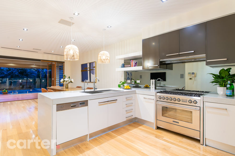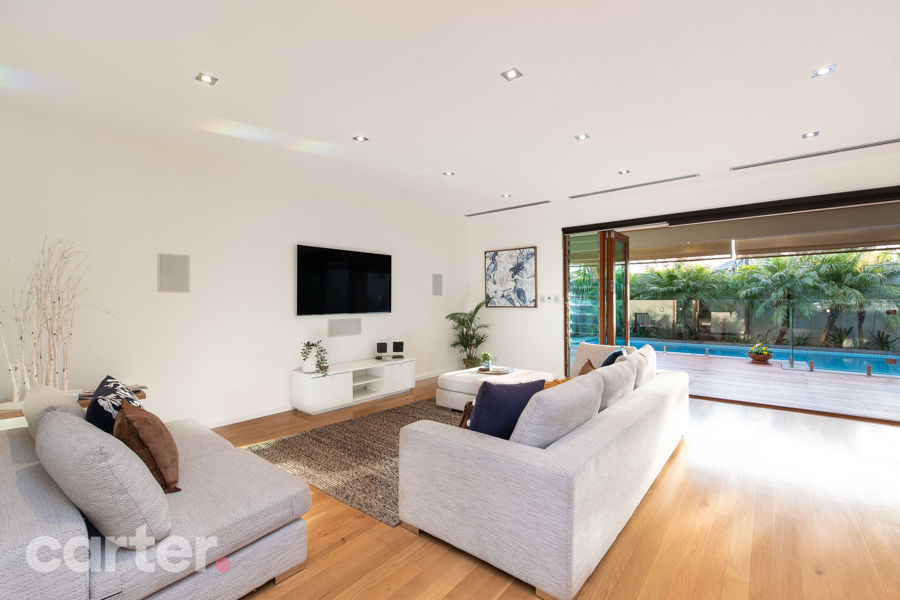 But this is really all about the open-plan rear, where that stone and stainless steel laden kitchen looks out through sliding cafe stacker doors to a party-ready pavilion that throws a sun-safe retractable awning over your heated, tiled pool. Hello, summer.