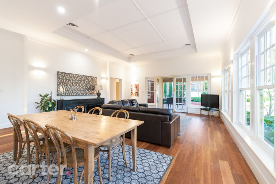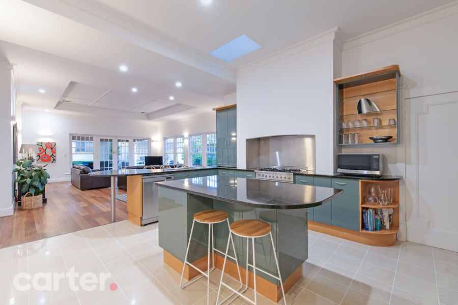 A recent cosmetic renovation ensures the likes of its original Jarrah floors, lofty decorative ceilings, fireplaces and large light-filled spaces have never looked so magnificent in a 4-bedroom home with a JAG kitchen overlooking one of the more far-reaching open-plan extensions we've seen.