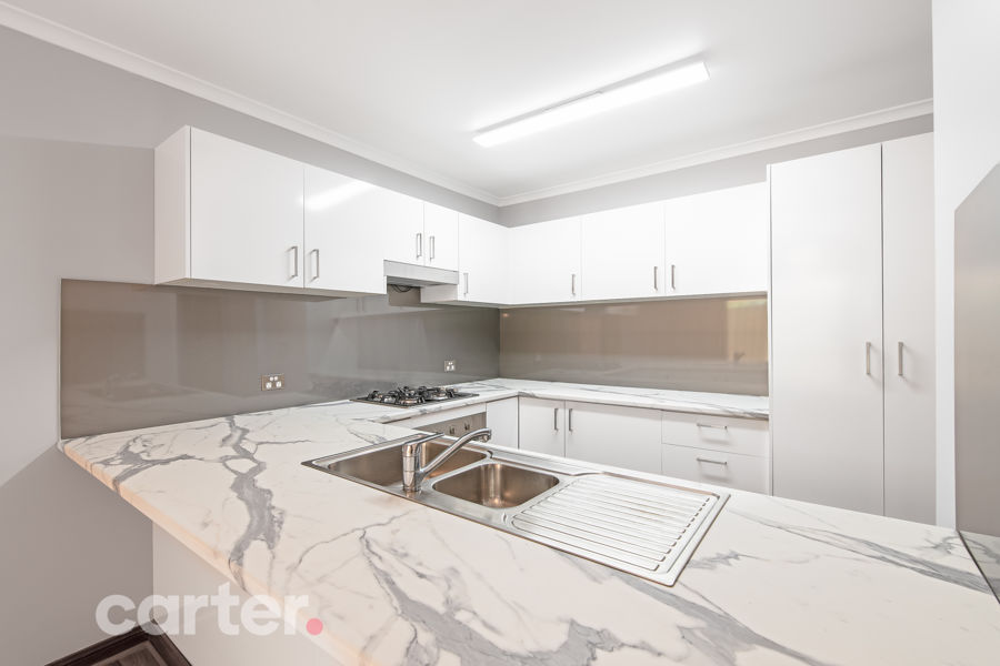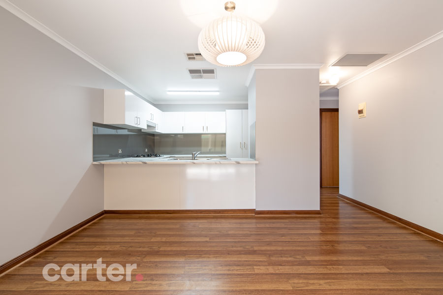 Not a crumb has ever been spilled in this brand new kitchen with marble-style benchtops, dishwasher, gas cooktop and a breakfast bar at the head of a casual meals zone with new floors.