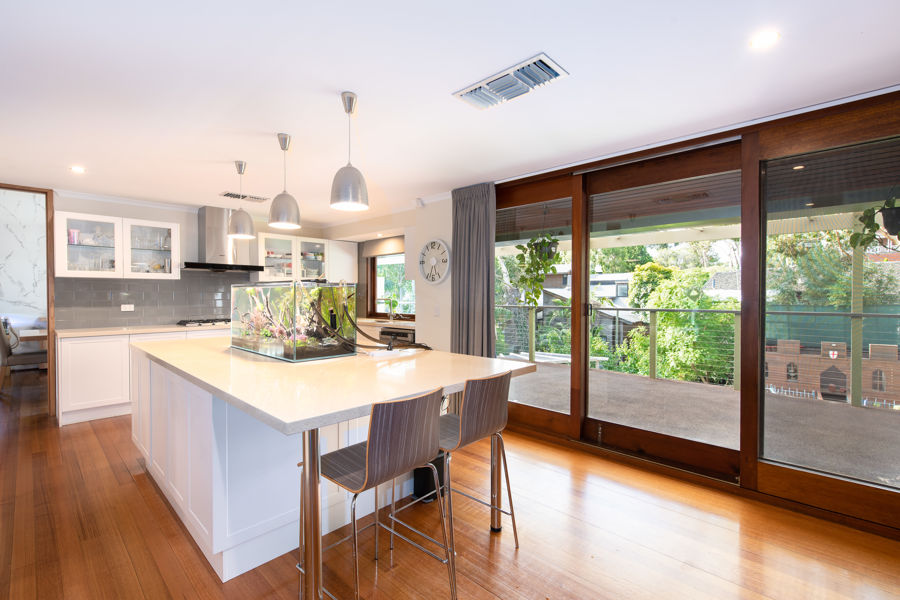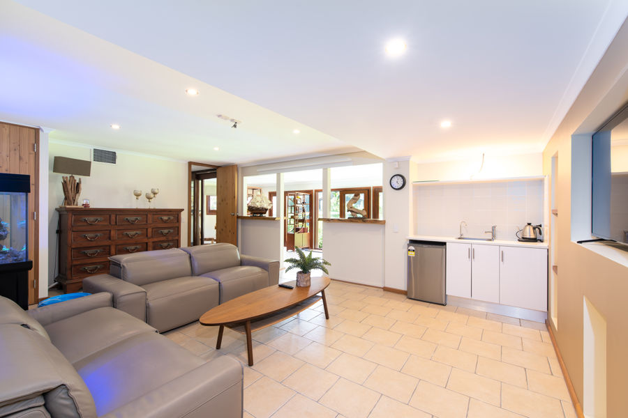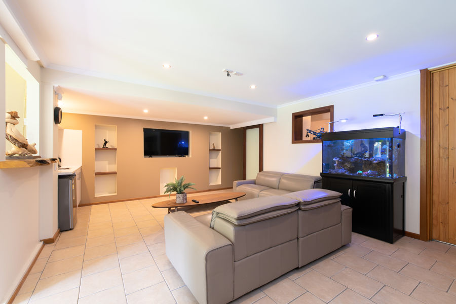 Several spaces feed the terrace, including a striking and spacious stone-topped kitchen, an expansive lounge/family room and a master bedroom with its own ensuite and private access to the BBQ area/pavilion.