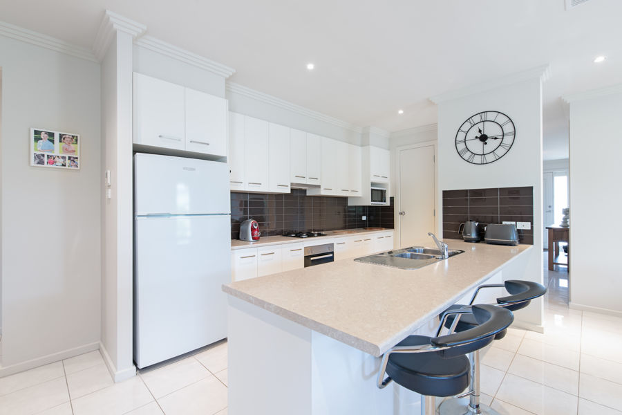 With a gas cooktop, expansive breakfast bar, walk-in pantry and plenty of storage, the ultra-functional kitchen looks the part at the head of a free-flowing, light-filled living zone.