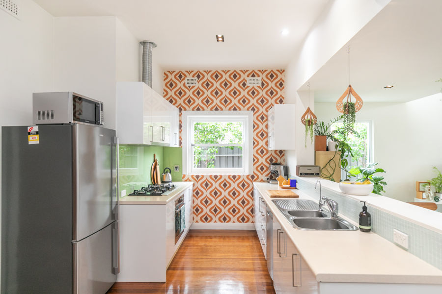 A modern light filled extension designed by architect Luke Willis offers a spacious family living area, served by a kitchen with stainless steel appliances including a dishwasher and six-burner gas cooktop.